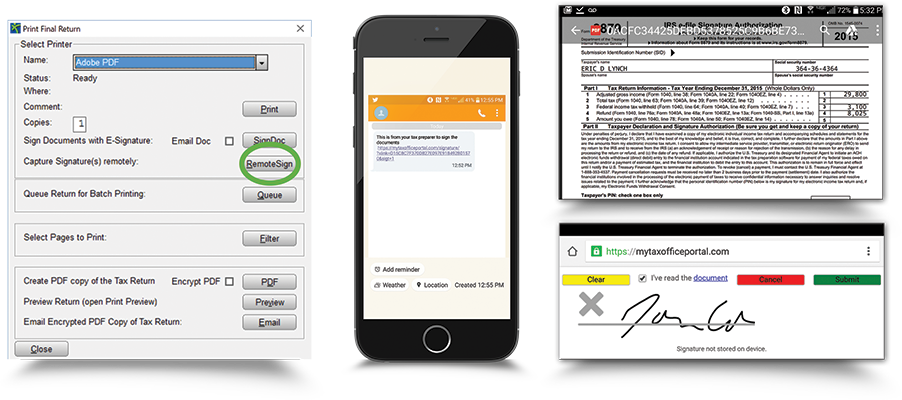 Your Tax Doctor Software customers now have the ability to request a remote signature from a non-present taxpayer and/or spouse at the time of tax return completion. After authenticating their identity, the taxpayer/spouse can review a PDF of the tax return and sign it using their mobile device.